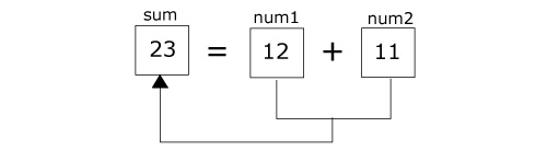 scanf( ) function. Then, + operator is used for adding variables num1 and num2 and this value is assigned to variable sum.There are three variables used for performing this task but, you can perform this same task using 2 variables only. It can done by assiging the sum of